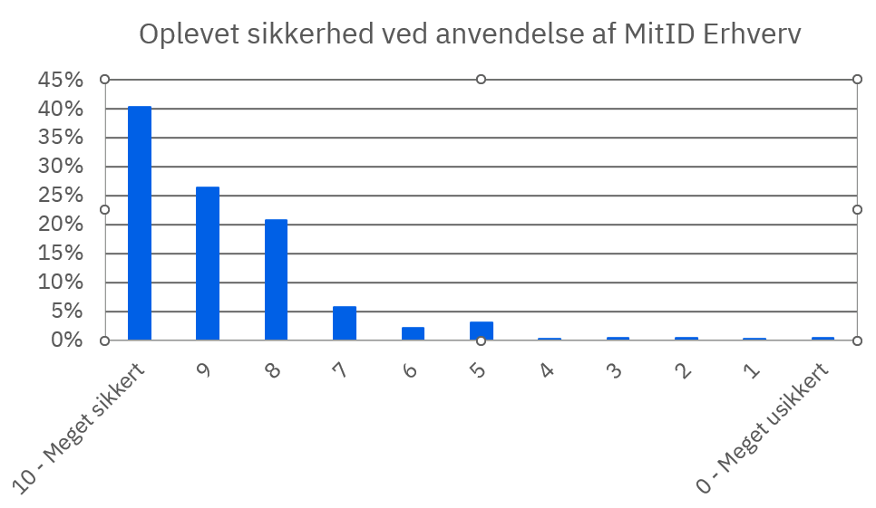 Flere adspurgte i den nye måling oplever desuden, at det er sikkert at anvende MitID Erhverv. I 2025 fandt 93 pct. af de adspurgte løsningen overvejende sikker at anvende (7 eller derover på en skala fra 0 til 10). Heraf havde 40 pct. af de adspurgte i 2025 vurderet MitID Erhverv som meget sikkert (10 ud af 10) at anvende. Dette mod 31 pct. i 2024.